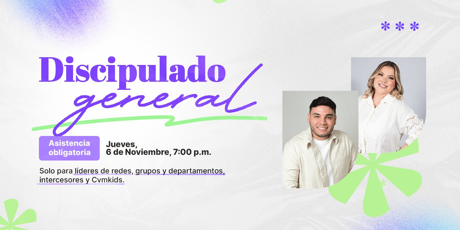 1 evento, ¡Prepárate para el encuentro que cambiará tu vida! Este no será un evento más… será una experiencia única para 500 jóvenes que buscan algo real, algo que transforme su corazón y su futuro. En este encuentro, Dios va a marcar tu vida de una manera poderosa, despertando en ti un propósito que jamás imaginaste. $150.000,00 | 0 eventos, | 0 eventos, | 1 evento, Nuestro Discipulado General es un espacio de formación y dirección para todos los líderes, intercesores y maestros de CVMKids de Cristo Vive en Mí. Cada quince días nos reunimos para recibir enseñanza, alinearnos con la visión y fortalecer nuestro carácter como discípulos de Jesús. Gratuito | 0 eventos, | 0 eventos, | 0 eventos, |